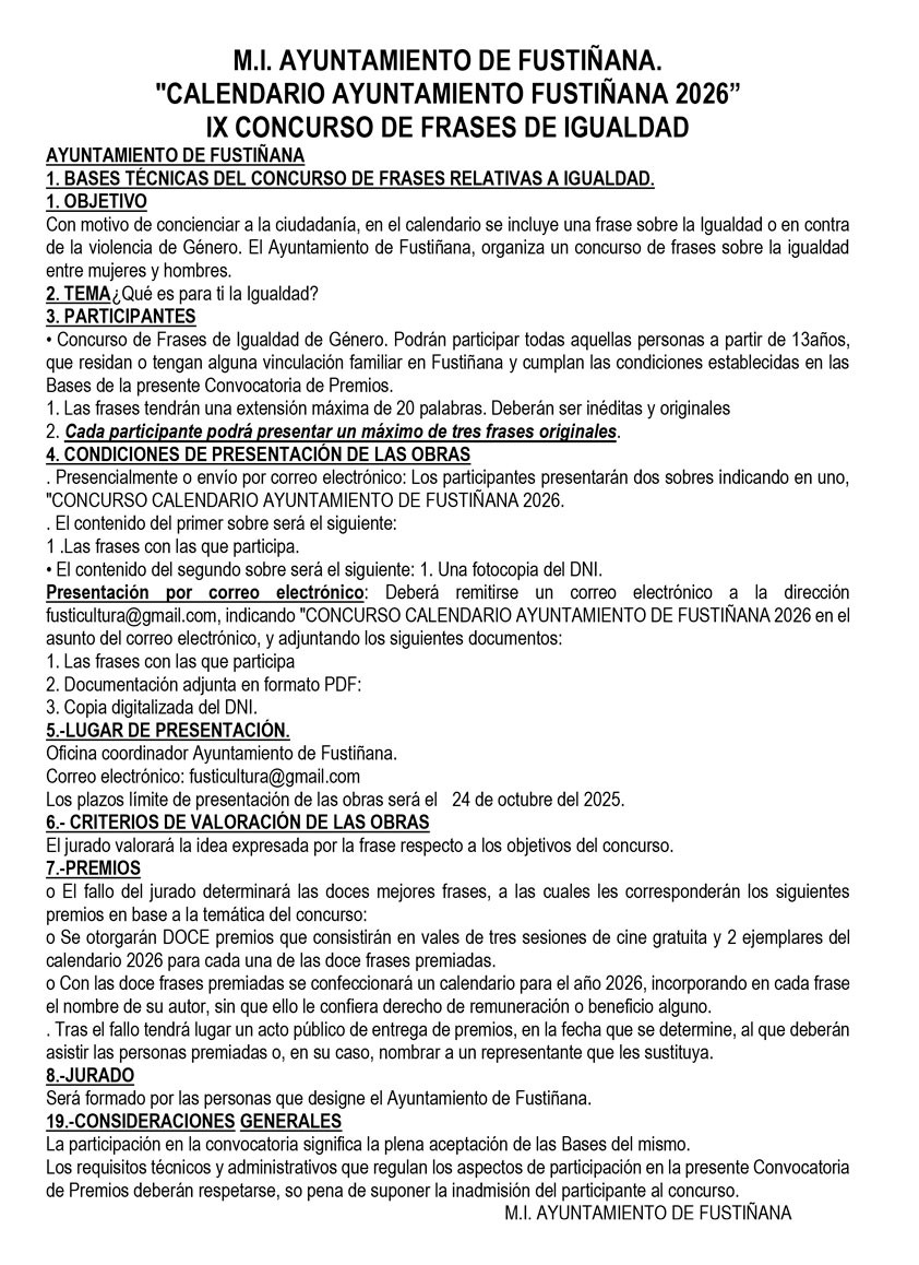 Plazo de presentación: hasta el viernes 24 de octubre. Lugar: Ayuntamiento o fusticultura@gmail.com Bases en documentos adjuntos.